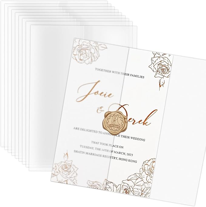 08 inches when folded, perfectly accommodating 5×7 invitations. Made of robust kraft paper, the smooth and sturdy texture ensures durability, while the transparent quality adds a classy, matte finish. Built for versatility, they are ideal for weddings, banquets, and more.